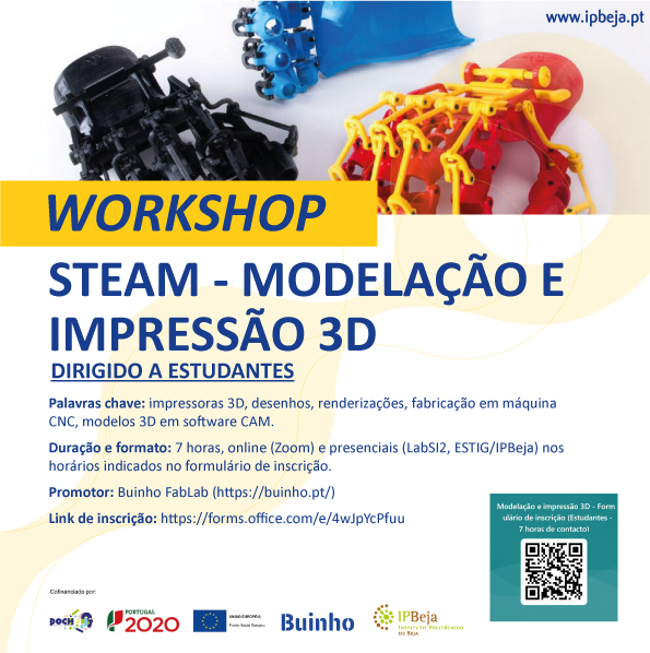 O Instituto Politécnico de Beja promove “Workshops STEAM – modelação 3D” com o objetivo de criar peças e montagens 3D, englobando desenhos, renderizações e preparação para fabricação em impressora 3D ou máquina CNC.