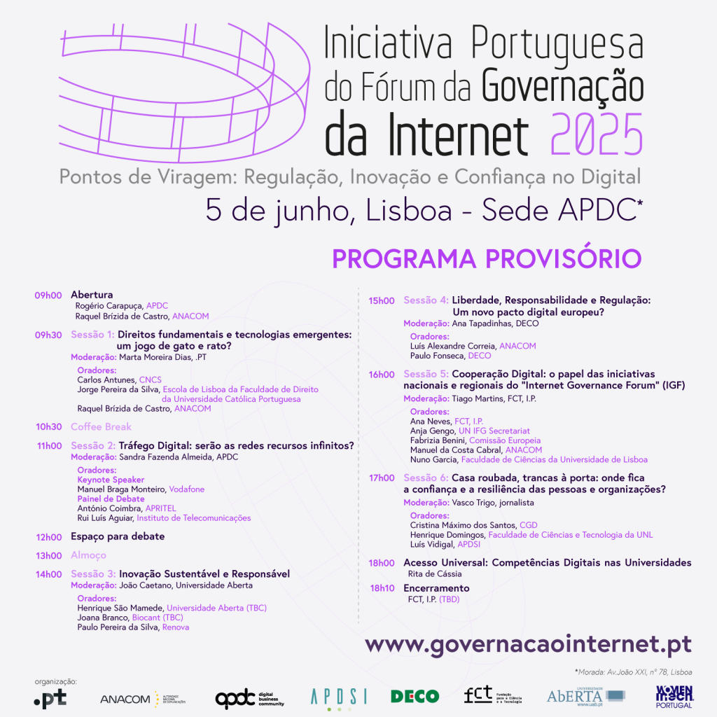 Organizada pelo .PT, ANACOM, APDC, APDSI, DECO, FCT I.P., Universidade Aberta e Women in Tech Portugal, irá este ano voltar a debater o relevante tema da Governação da Internet.