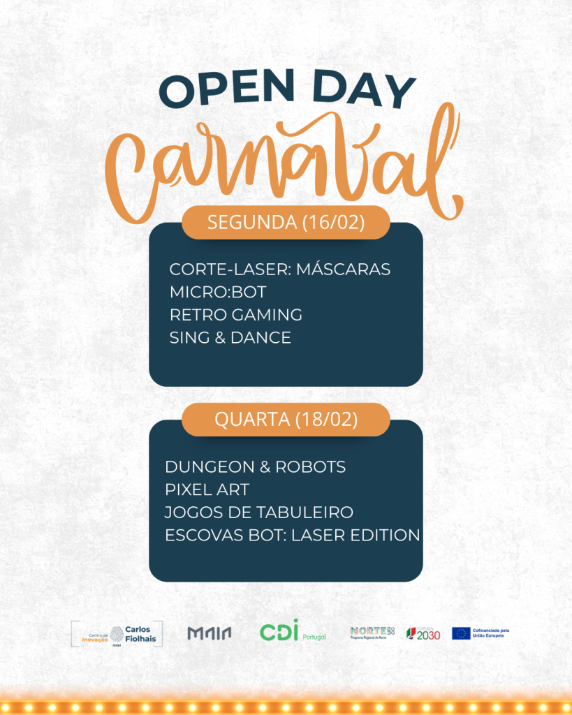 O Carnaval no Centro de Inovação Carlos Fiolhais (CICF) celebra-se nos dias 16 e 18 de fevereiro, com atividades práticas e inovadoras que combinam arte, gaming, robótica e fabricação digital. Com uma metodologia hands-on, oferecemos experiências diversificadas que respeitam diferentes interesses e estilos de aprendizagem.