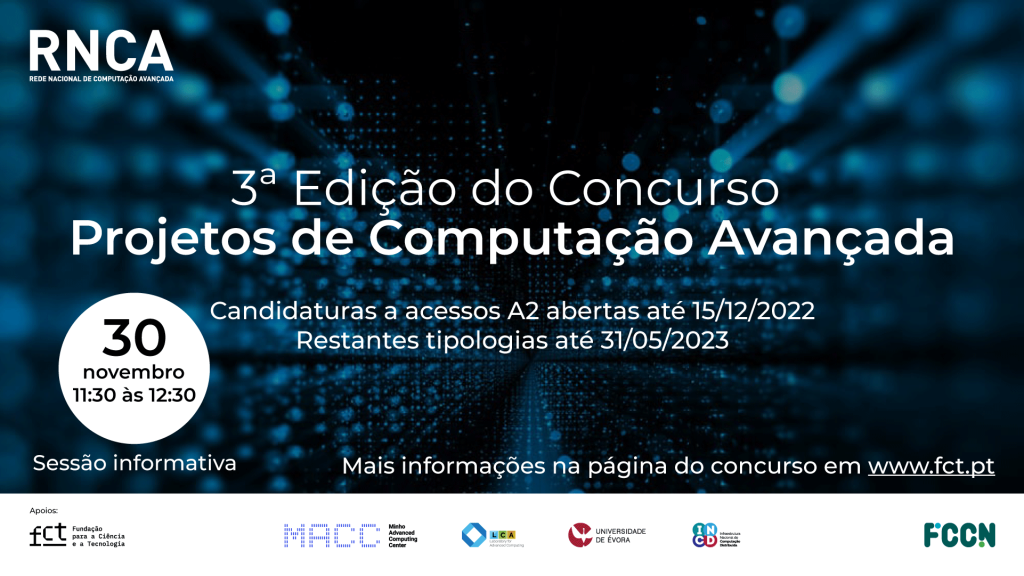 A Fundação para a Ciência e a Tecnologia, I. P. (FCT) gere a Rede Nacional de Computação Avançada (RNCA) e procura agregar os recursos nacionais de computação avançada, promovendo a cooperação entre os vários centros envolvidos e desenvolvendo parcerias nacionais e internacionais com outras entidades. Nos termos do Regulamento de Projetos de Computação Avançada, publicado sob o nº 10/2022 em Diário da República, a atribuição de recursos computacionais da RNCA é feita na sequência de um procedimento concursal cujos termos são divulgados através da página da FCT.