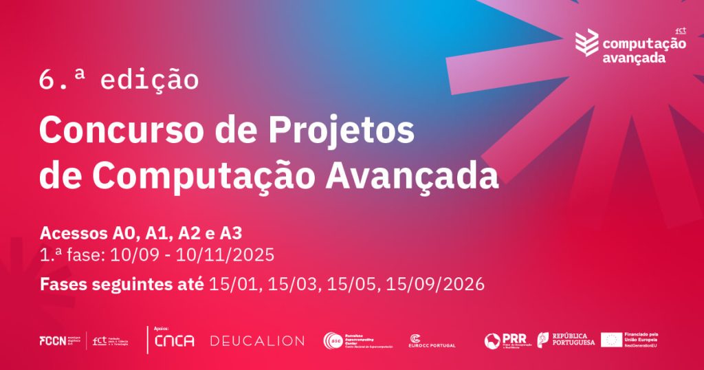 A Fundação para a Ciência e a Tecnologia (FCT), através da sua unidade de serviços digitais FCCN, dá início, a partir de 10 de setembro, à 6.ª edição do Concurso de Projetos de Computação Avançada, disponibilizando candidaturas para todas as tipologias de acesso: A0 – Acesso Experimental, A1 – Acesso Desenvolvimento, A2 – Acesso Regular e A3 – Acesso Maior Dimensão.